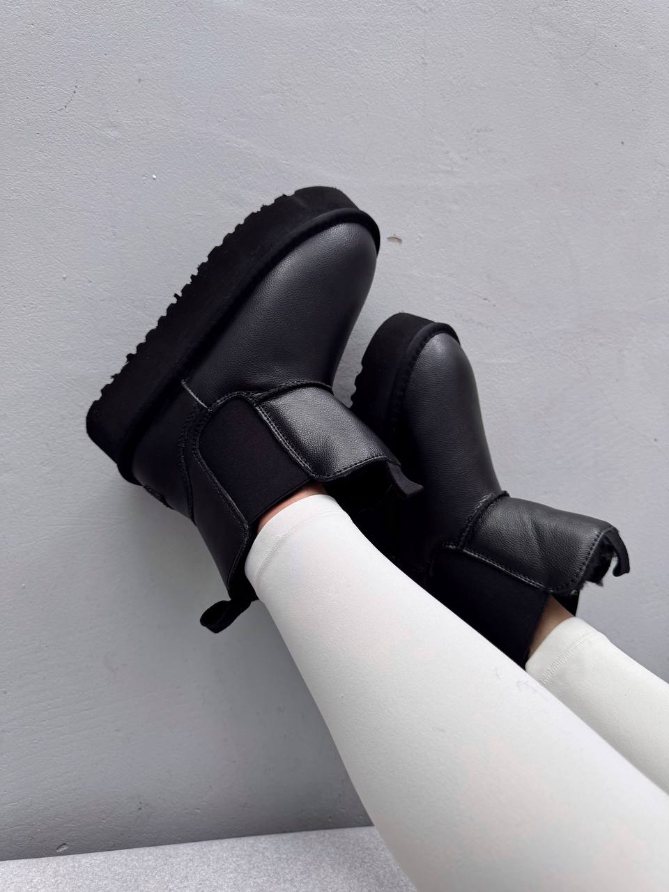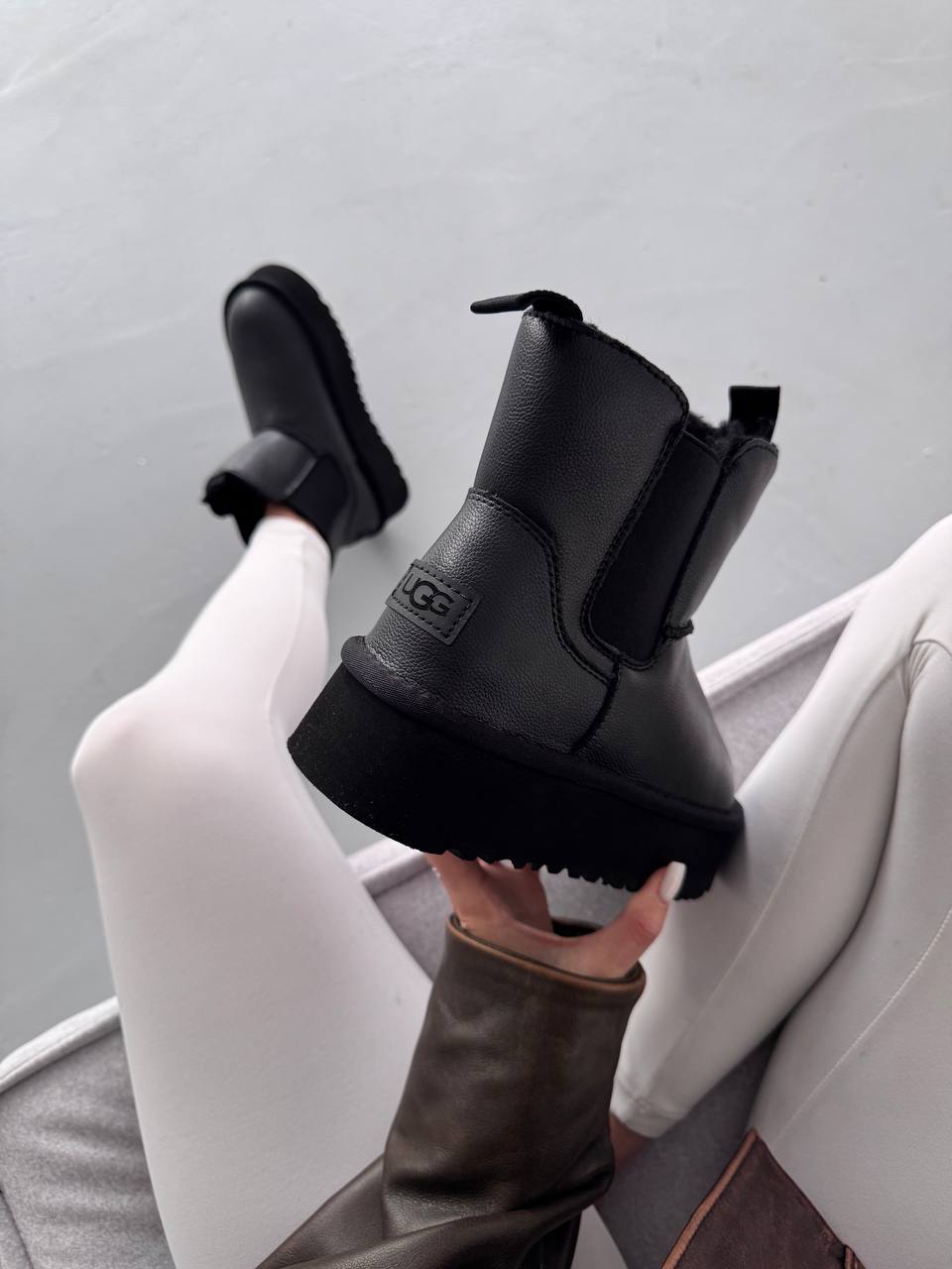 UGG Chelsea Lug Leather Boot Black — це чорні шкіряні черевики сторожового стилю з еластичними боковими вставками та м’якою внутрішньою підкладкою, що поєднують елегантність та практичність для щоденного носіння.