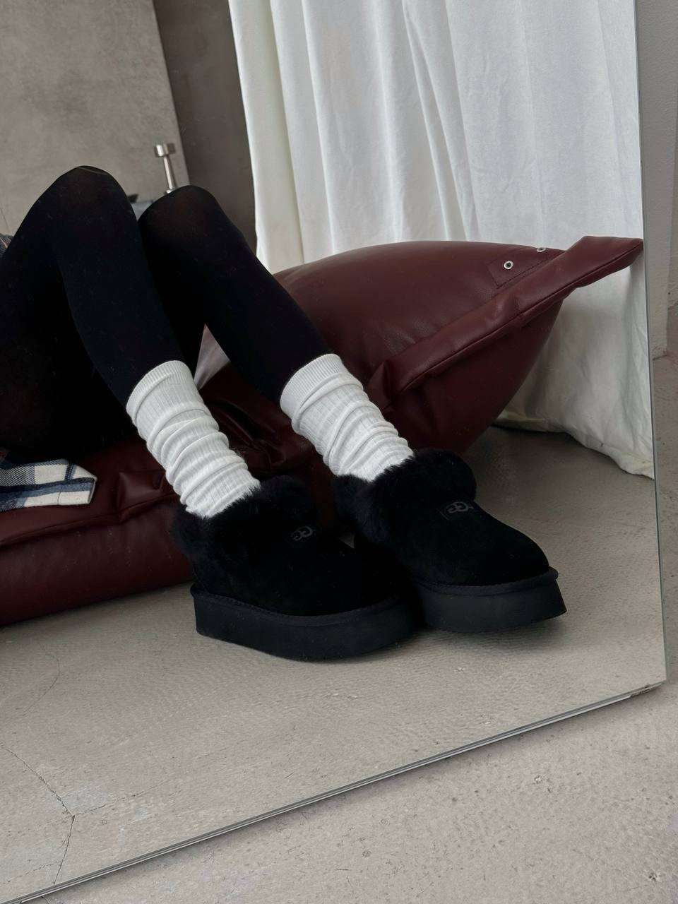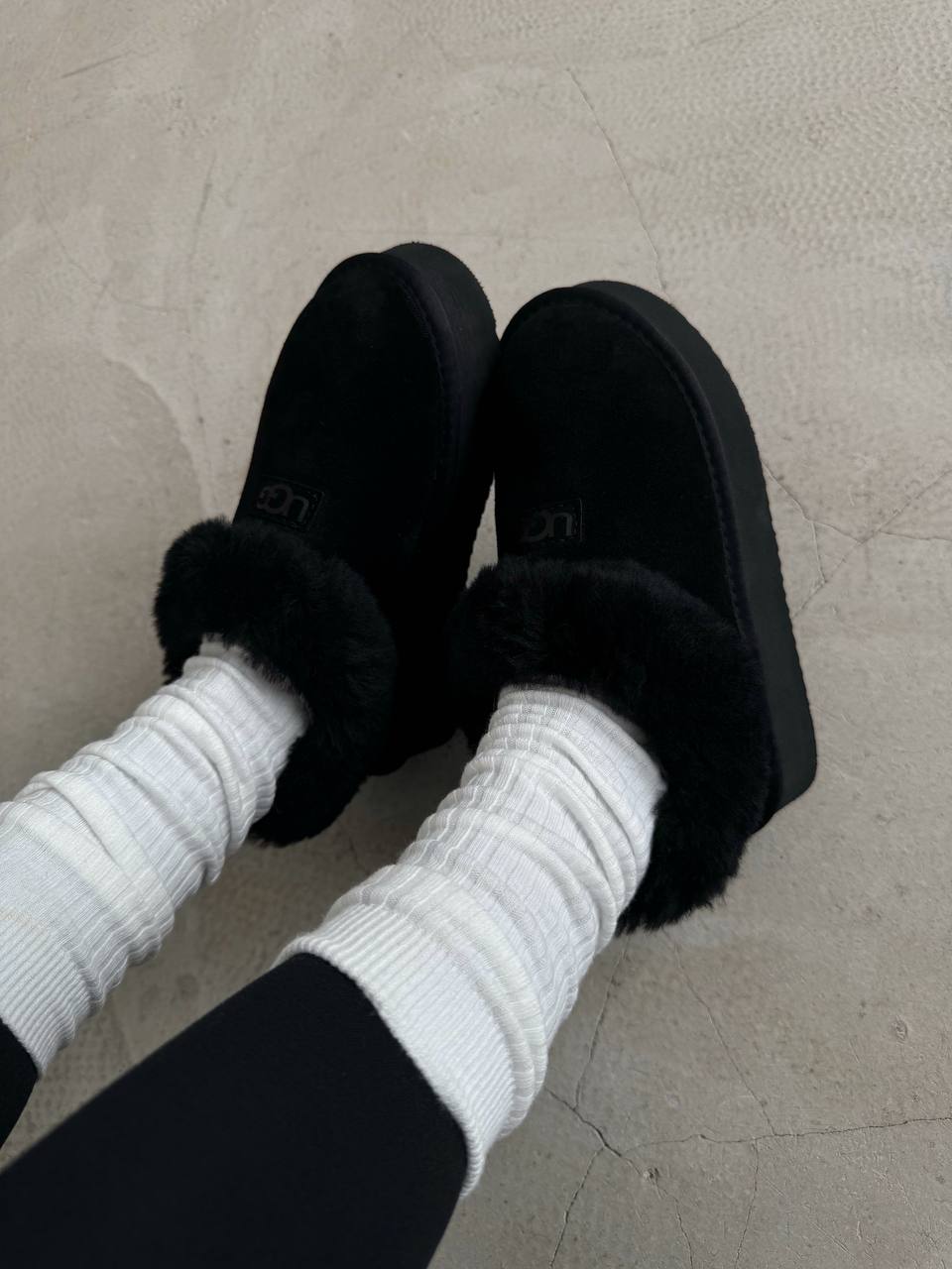 Ugg Coquette Platform Black Suede — це стильні та зручні тапки на платформі з чорної замші, утеплені овчиною для максимального комфорту й тепла.
