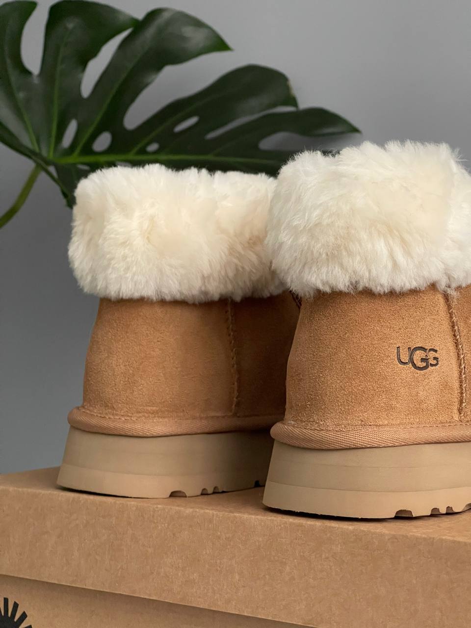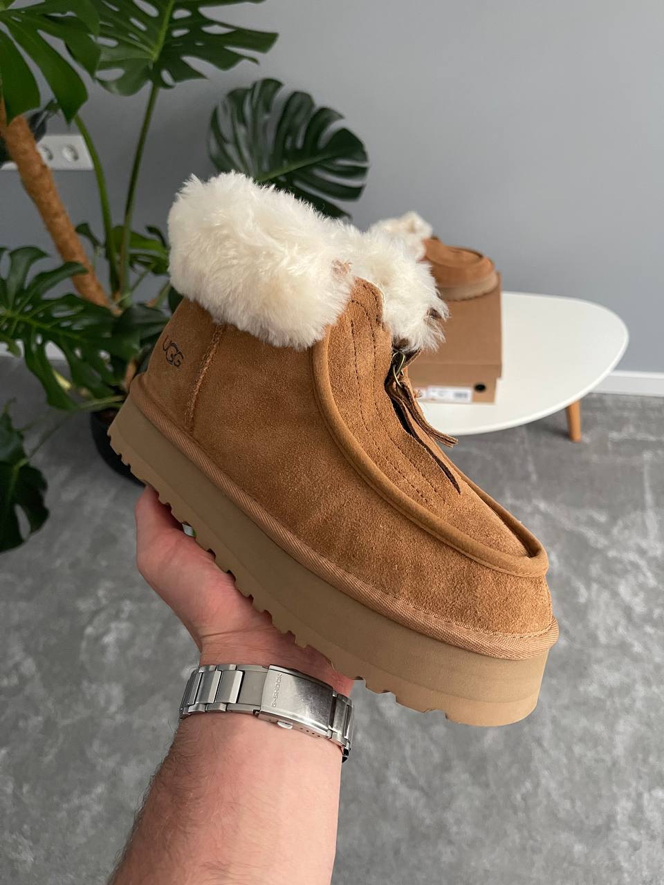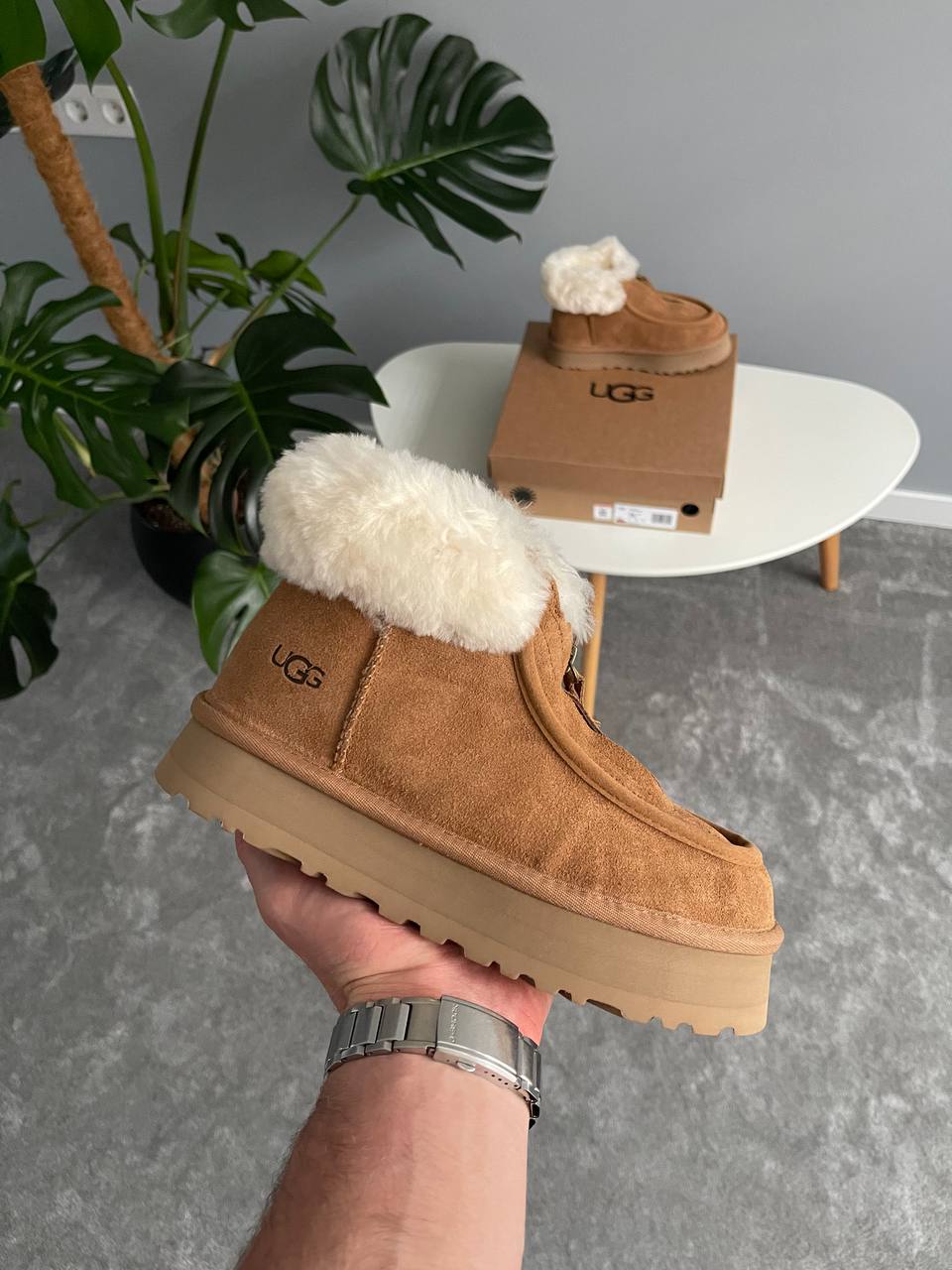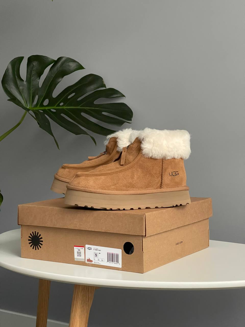 Ugg Funkette Chestnut Platform — це стильні замшеві чобітки каштанового кольору з високою платформою та м’яким вовняним утепленням для комфорту й сучасного вигляду.