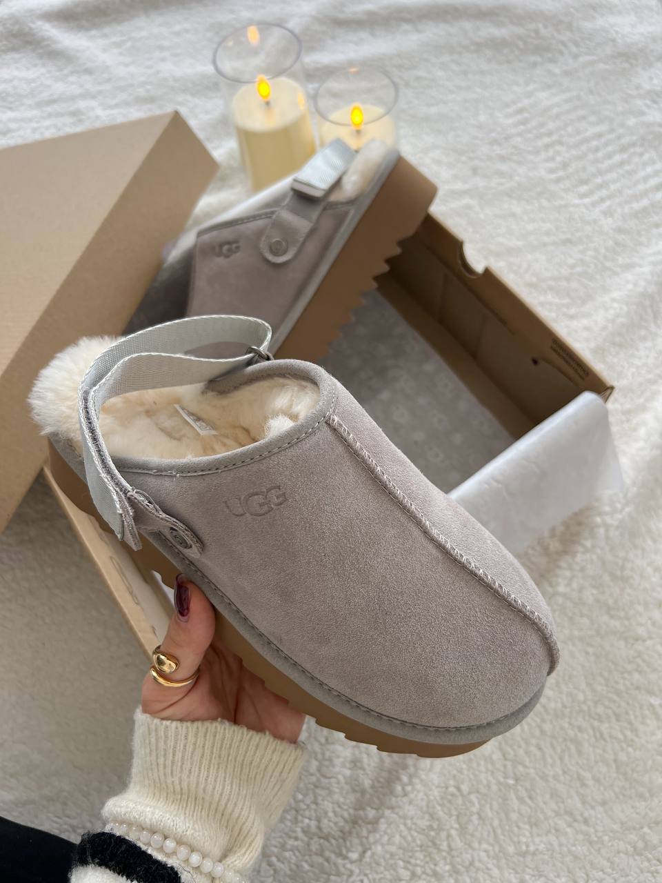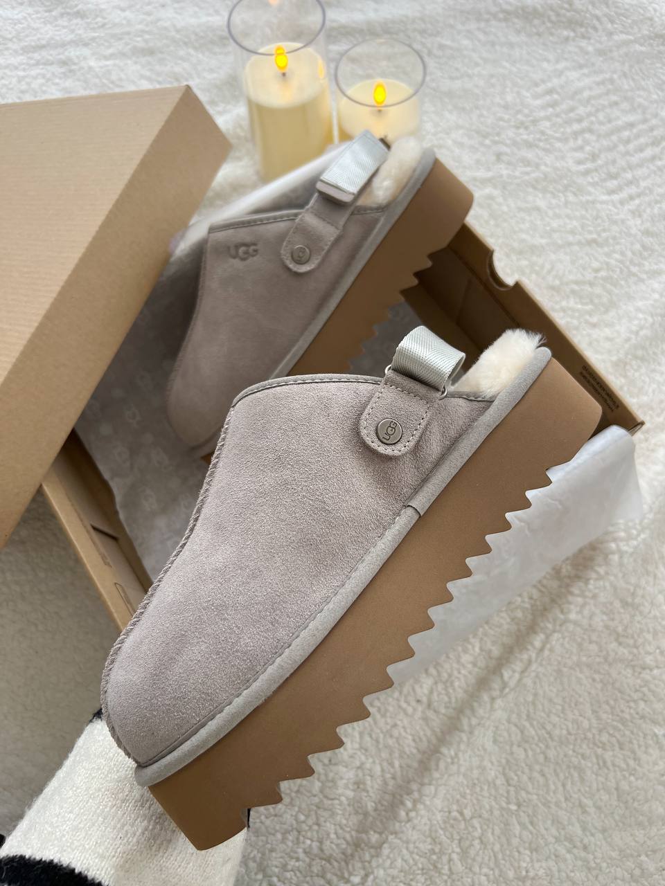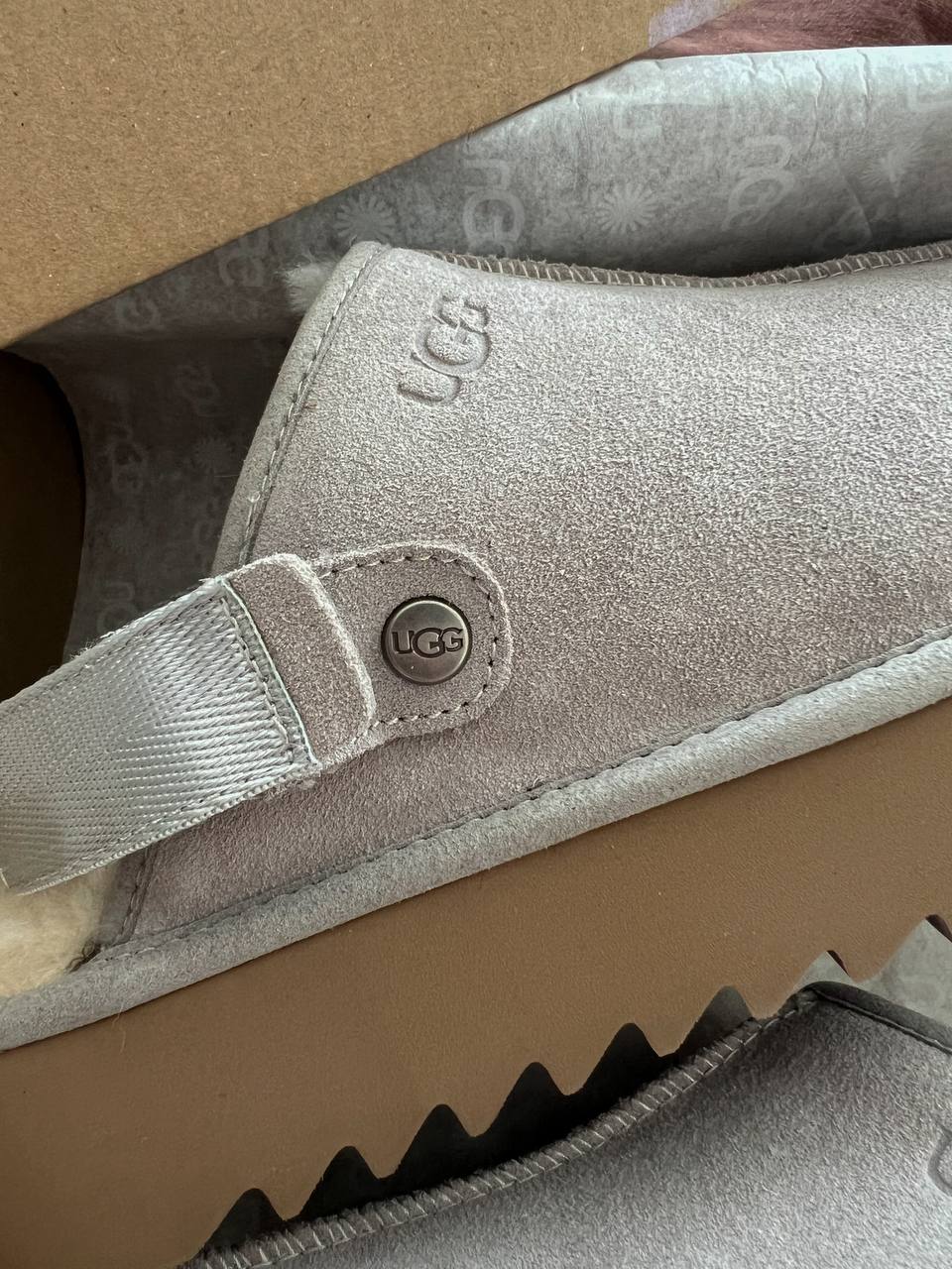 Ugg Lanah Clog Brown Grey Platform — це модні сабо на масивній платформі в поєднанні коричневого та сірого кольорів, які поєднують вінтажний стиль, сучасний силует і фірмовий комфорт UGG.
