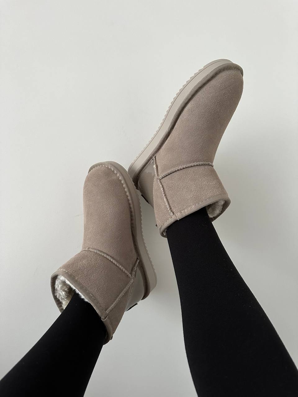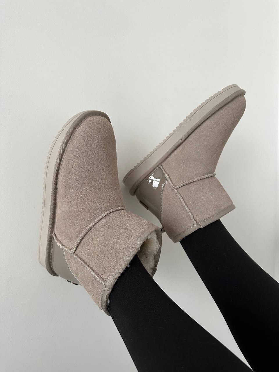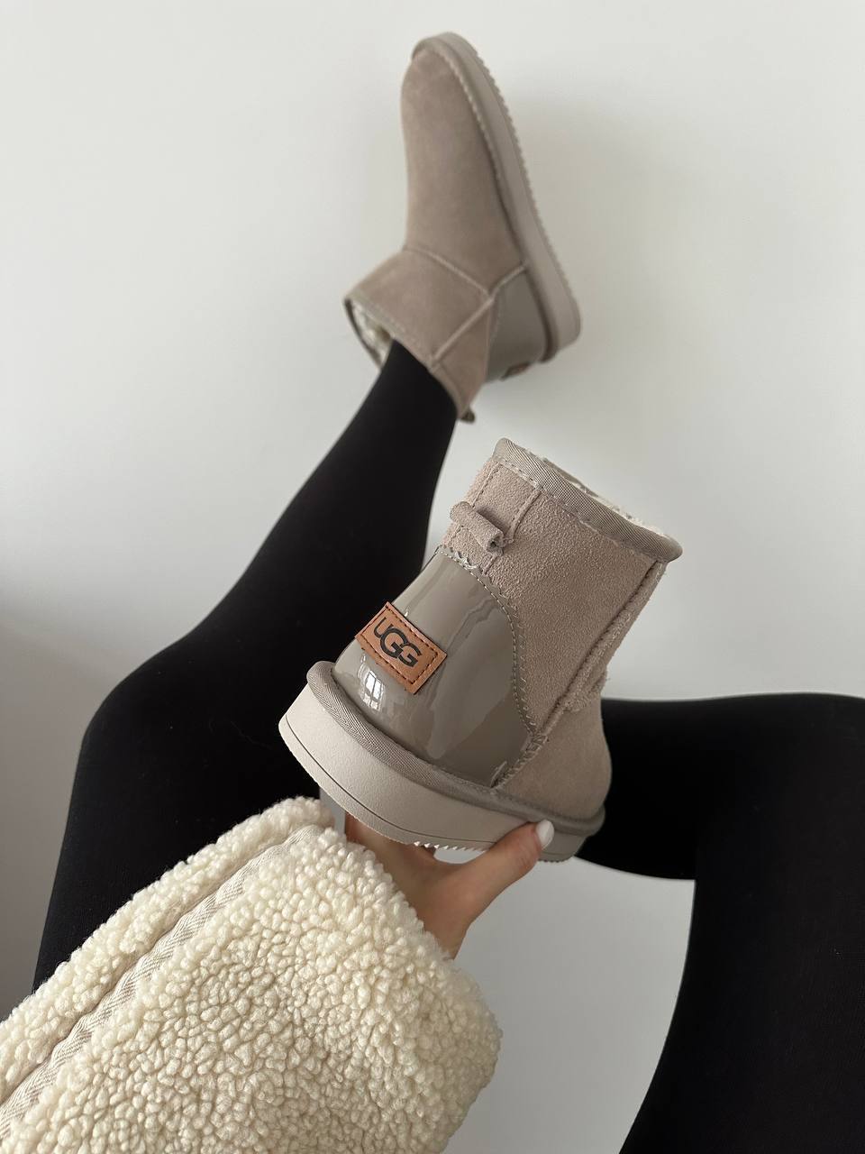 UGG Mini Latte Lacquer — це глянцеві укорочені черевики в ніжному відтінку латте, що поєднують водовідштовхувальне покриття з фірмовим комфортом та теплом UGG.