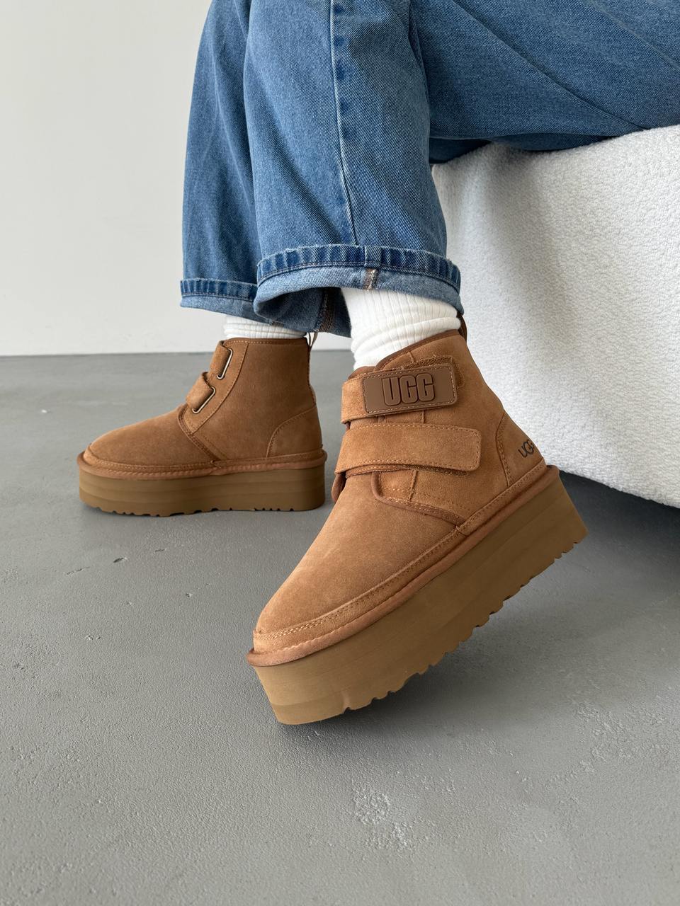 UGG Neumel Platform Velcro Chestnut — це утеплені зимові черевики на масивній платформі з м’якої замші в кольорі chestnut, доповнені зручною застібкою на липучці для стильного й комфортного повсякденного носіння.