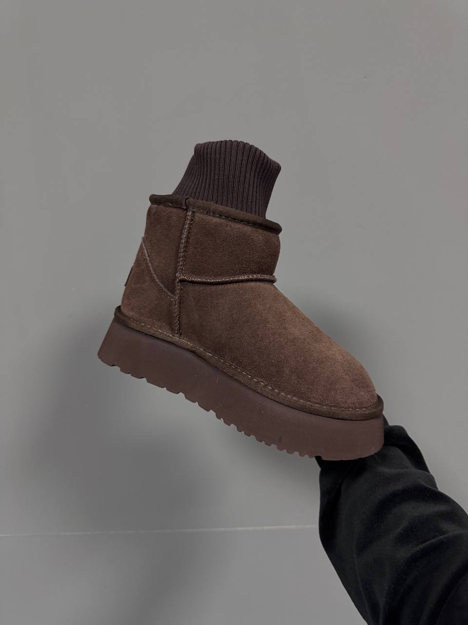 UGG Sock Dark Chocolate Suede — це м’які та зручні черевики-шкарпетки з темно-коричневої замші, що забезпечують тепло, комфорт і прилягання як у домашньому взутті, але з вуличною функціональністю.