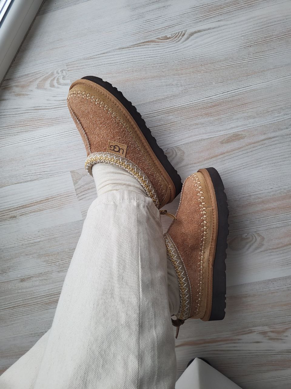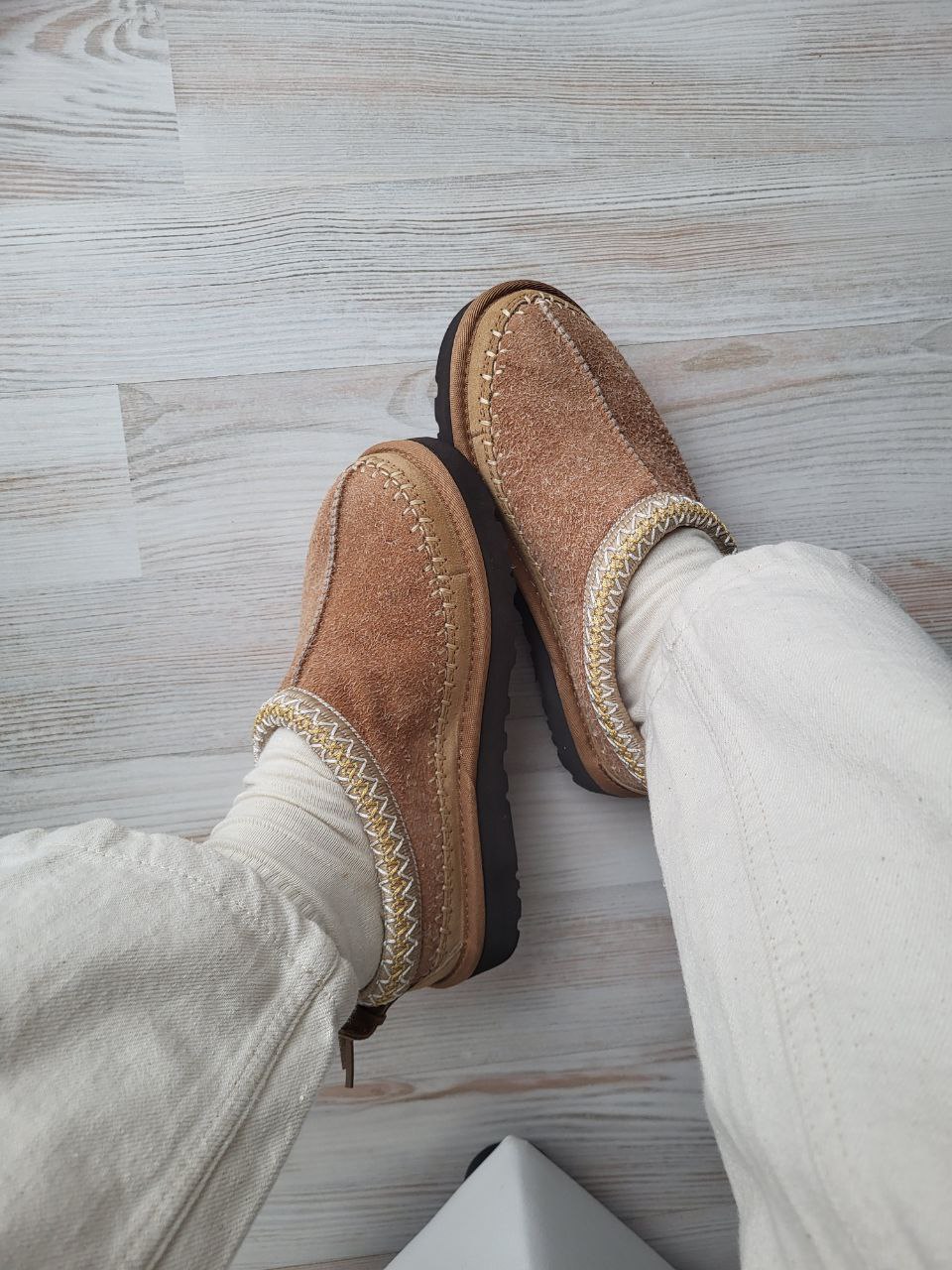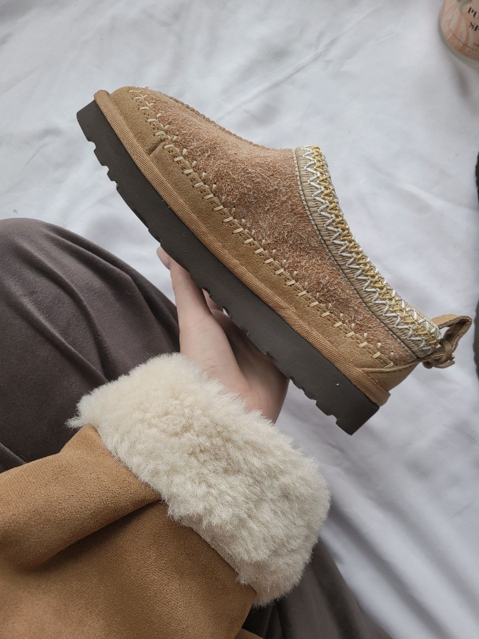 Ugg Tasman Biarritz Rocky Oak — це стильні замшеві тапки-клоги глибокого коричневого відтінку з м’яким вовняним оздобленням та фірмовою вишитою окантовкою, що дарують тепло й комфорт щодня.