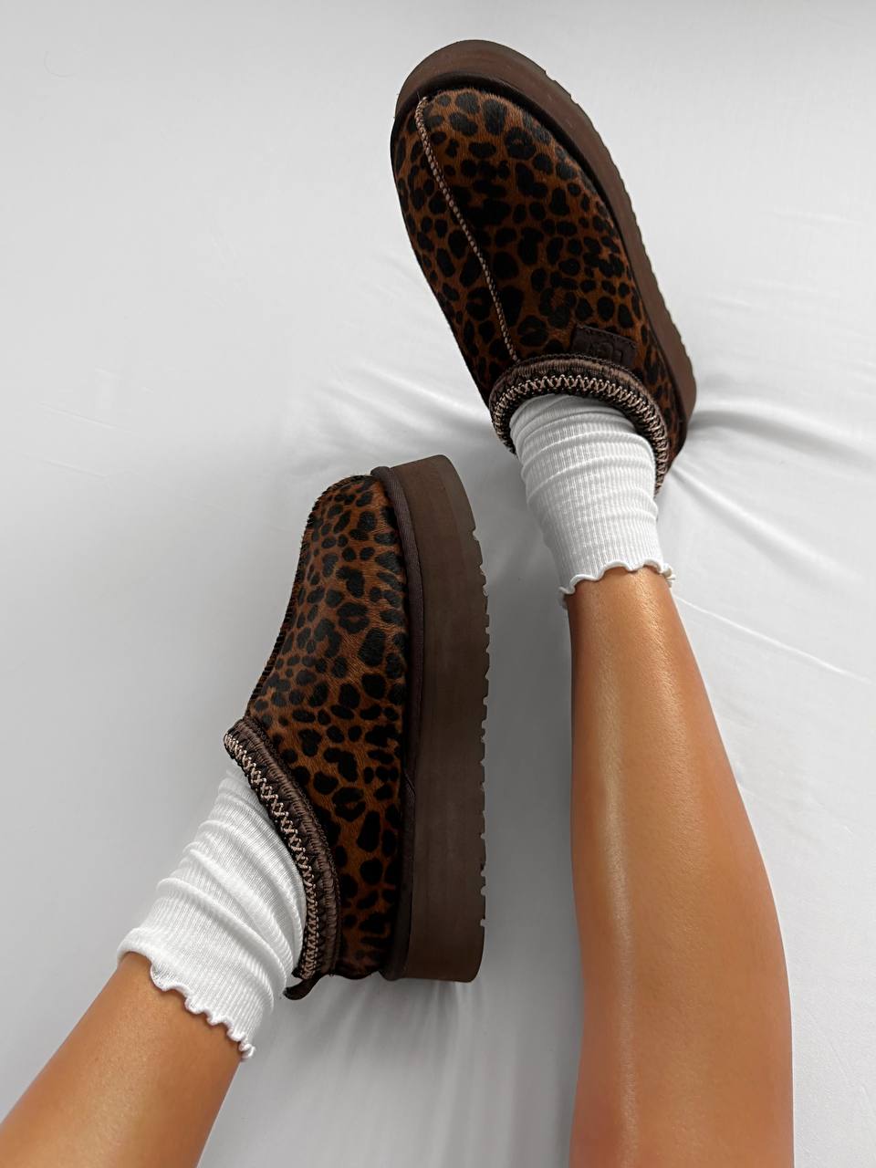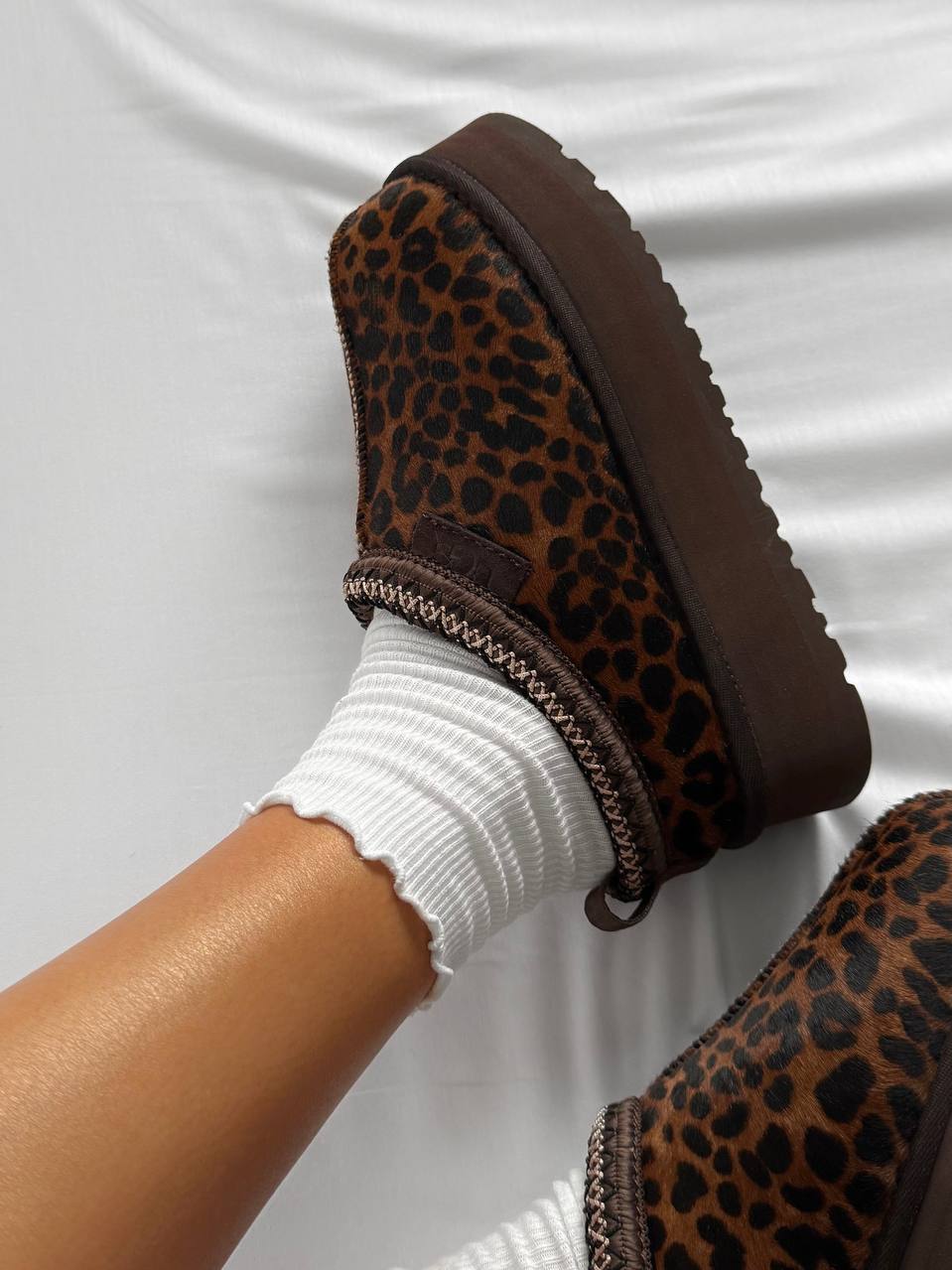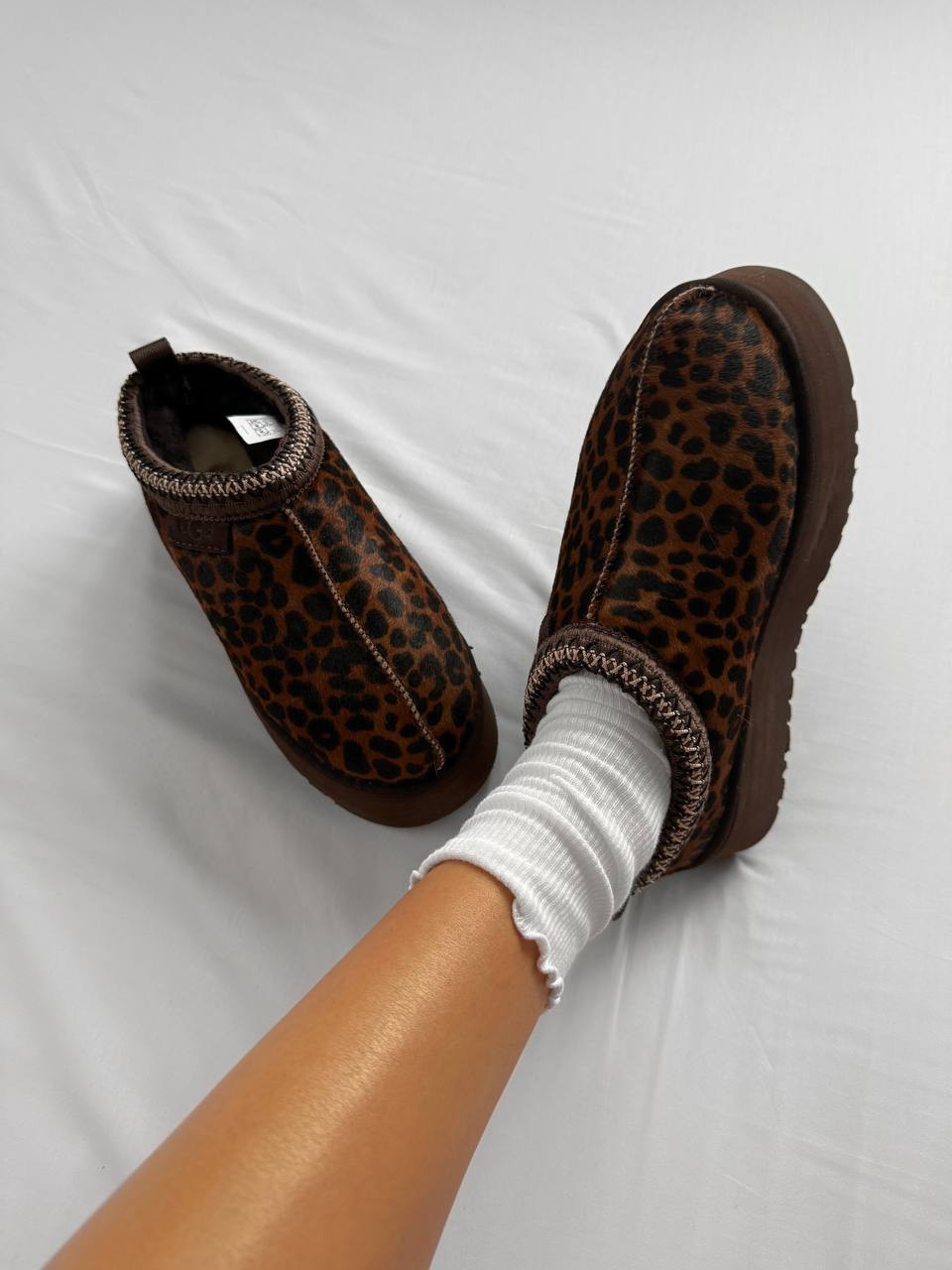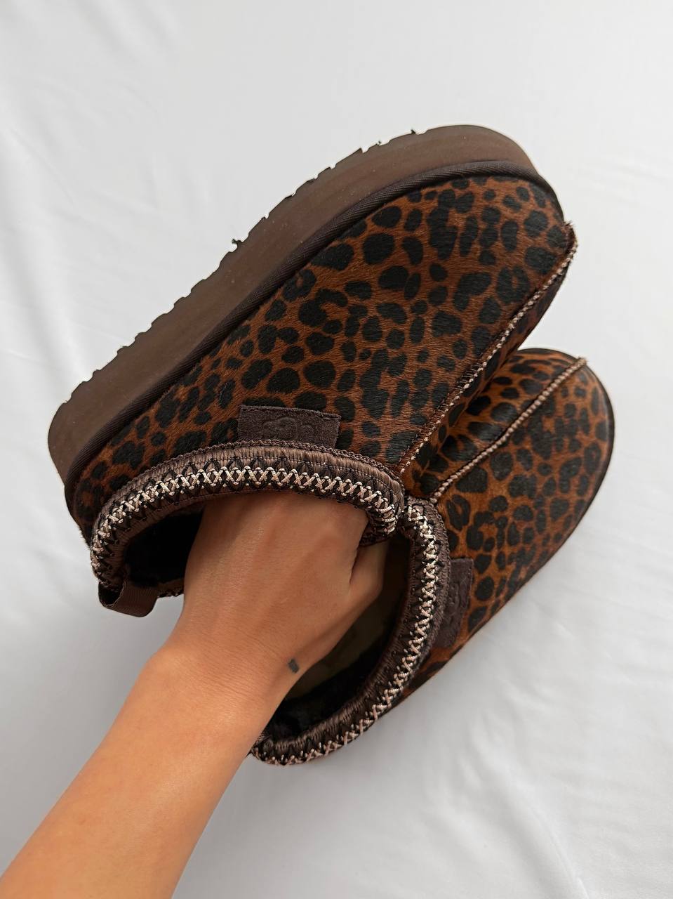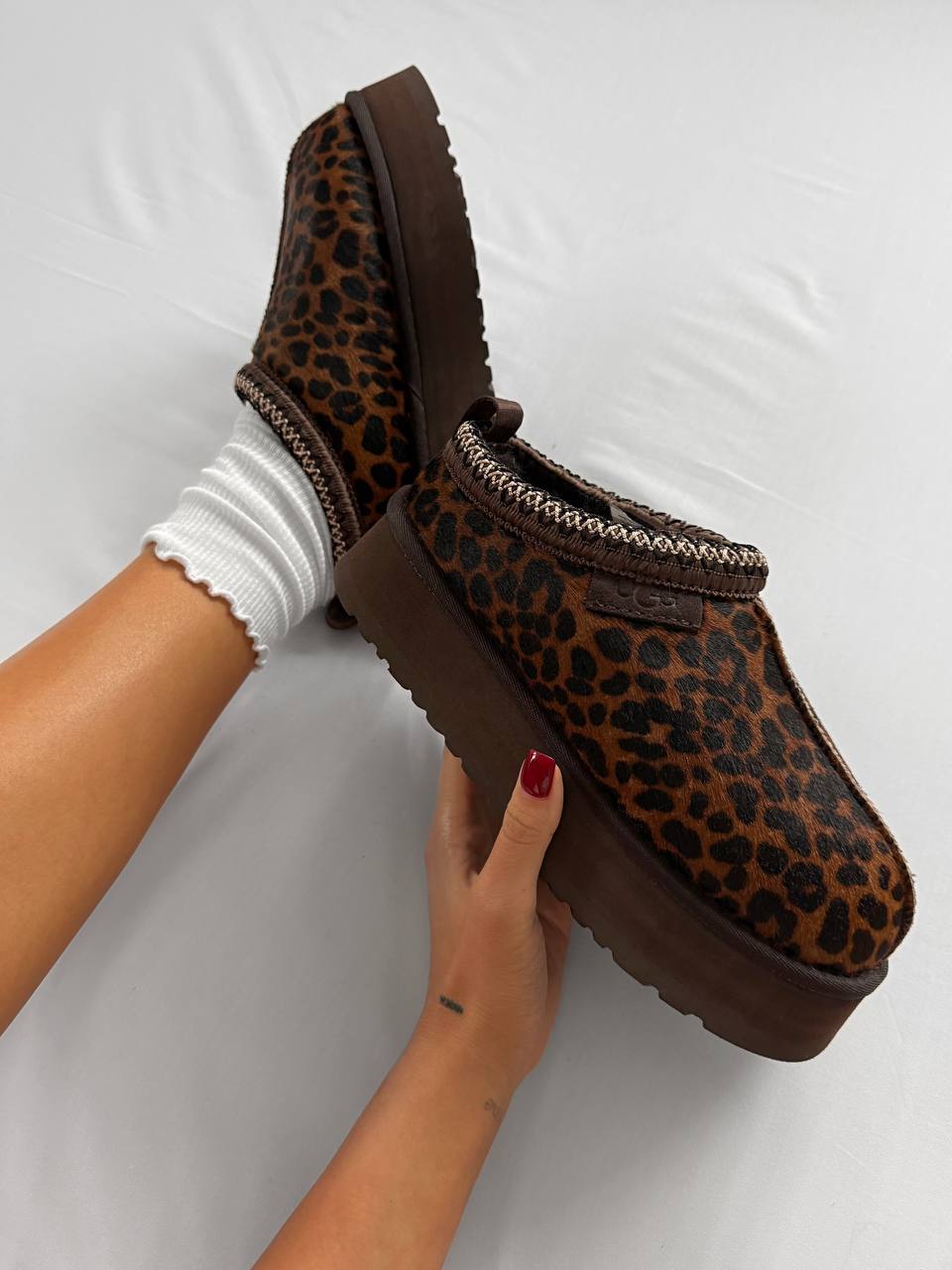 Ugg Tasman Platform Leopard — це стильні леопардові уггі на підошві-платформі з м’якою натуральною овчиною всередині, водовідштовхувальним верхом і теплою EVA-підошвою, що поєднують комфорт і модний принт у одному взутті
