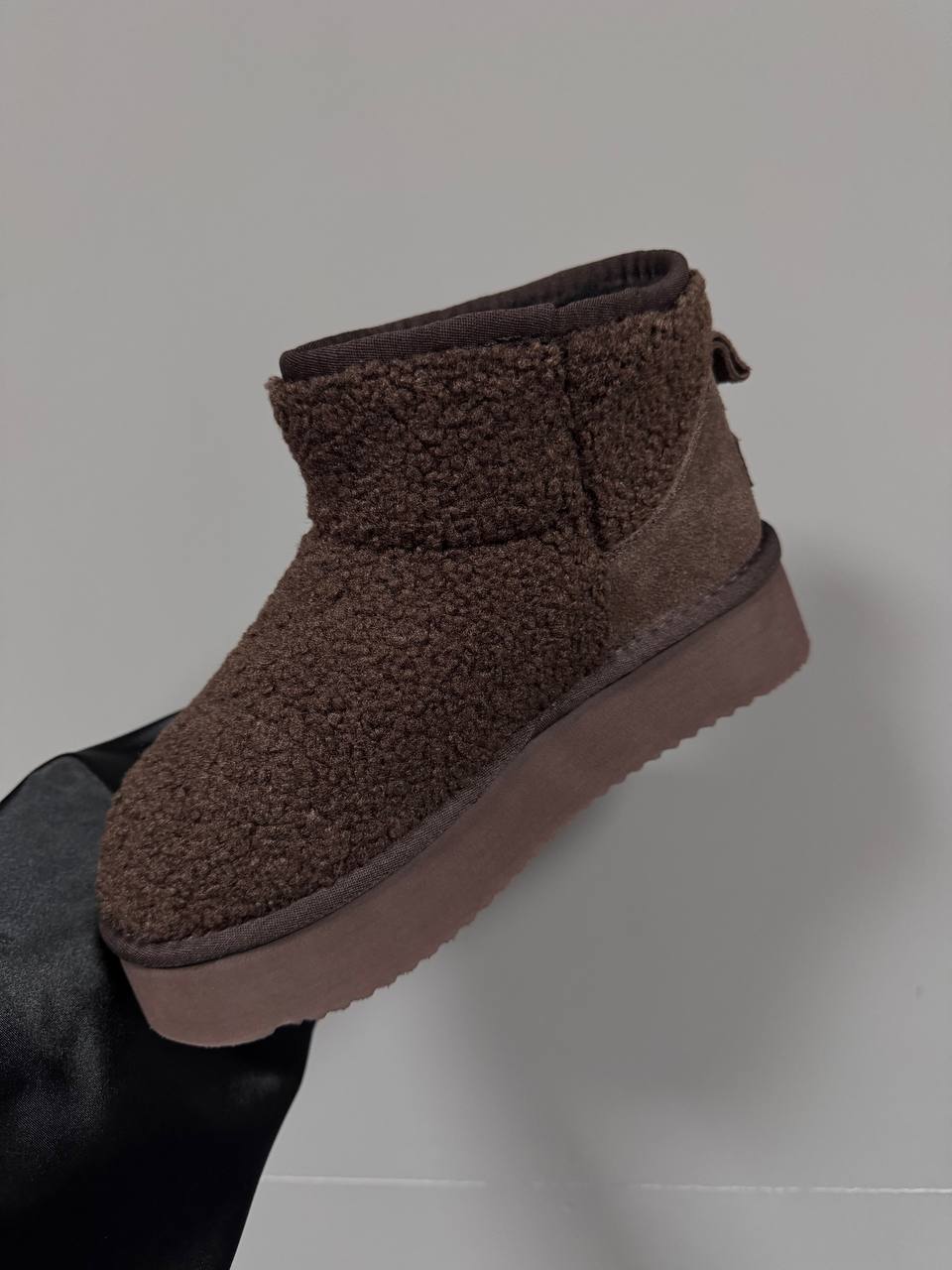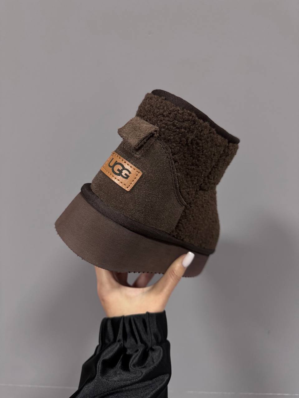 UGG Ultra Mini Platform Teddy Dark Brown — це утеплене взуття з плюшевим оздобленням у темно-коричневому кольорі на піднятій платформі, що поєднує затишок, тепло та трендовий стиль.