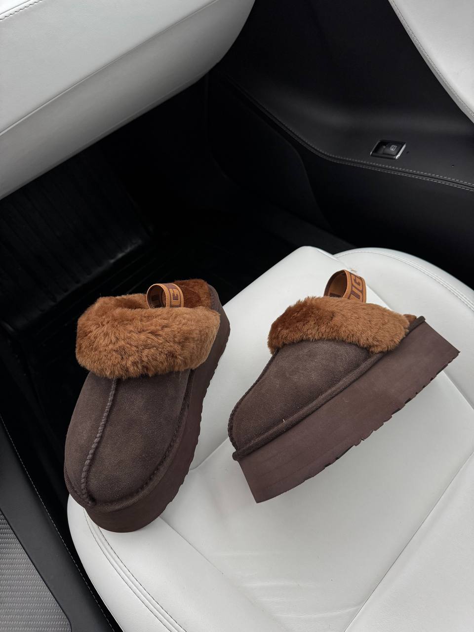UGG W Funkette Chocolate PREMIUM — стильні жіночі шльопанці з преміальної замші, м’яким хутром всередині та піднятою платформою для комфорту і яскравого образу.