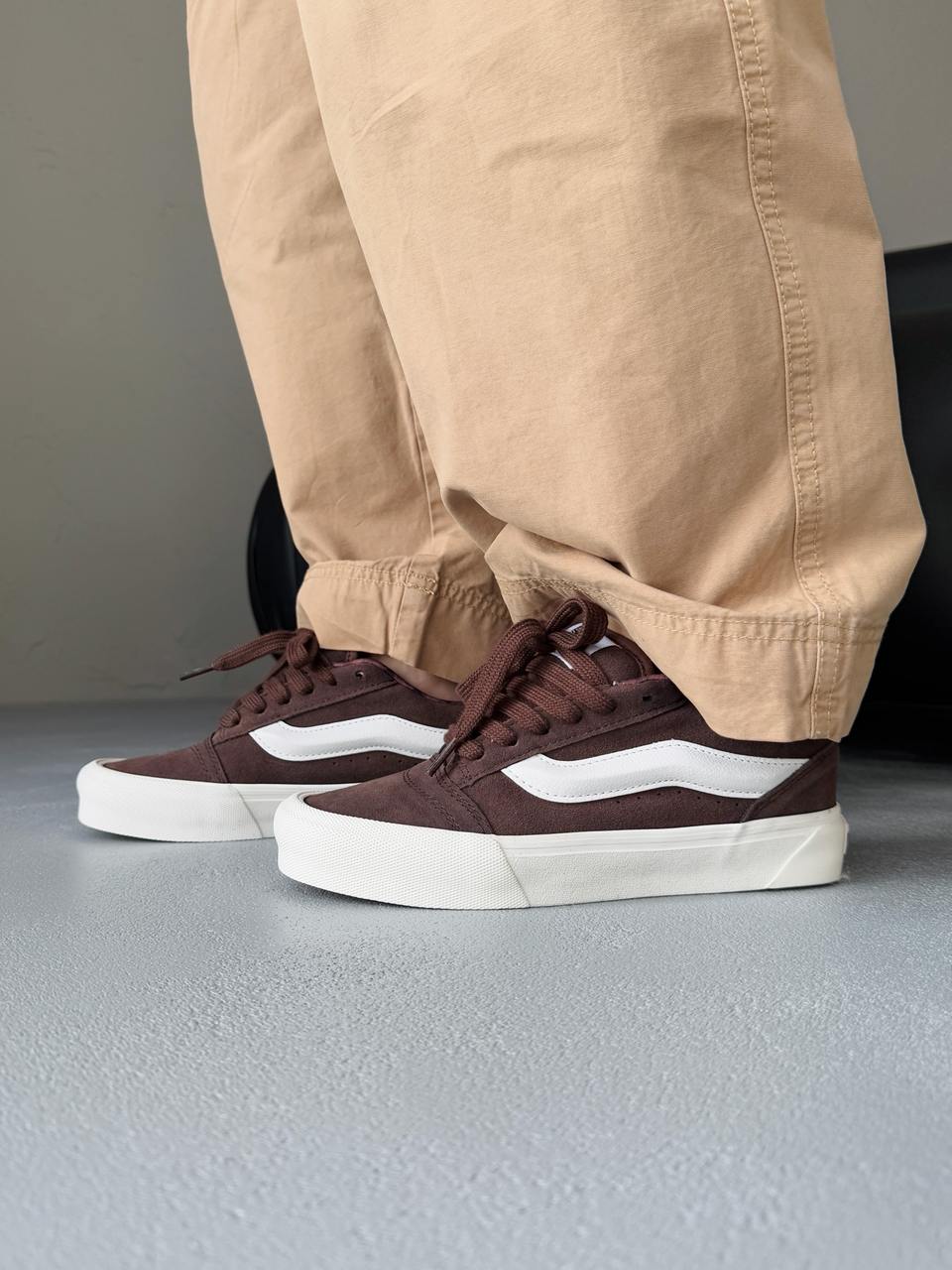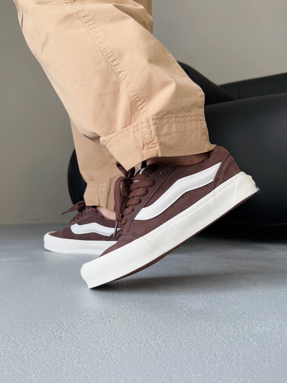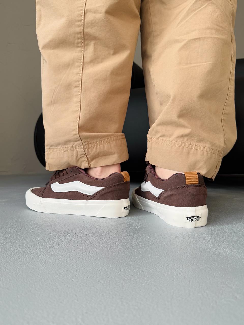 Vans KNU Skool Brown White — це поєднання масивного скейтерського силуету, теплої коричневої палітри та щоденного комфорту. Контраст коричневого з білими деталями створює стильний, трохи вінтажний образ, який виглядає актуально й виразно, а фірмовий дизайн Vans додає моделі впізнаваності та характеру.