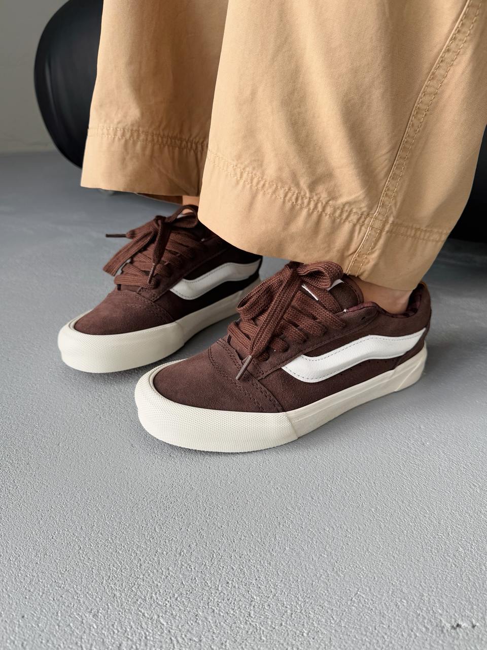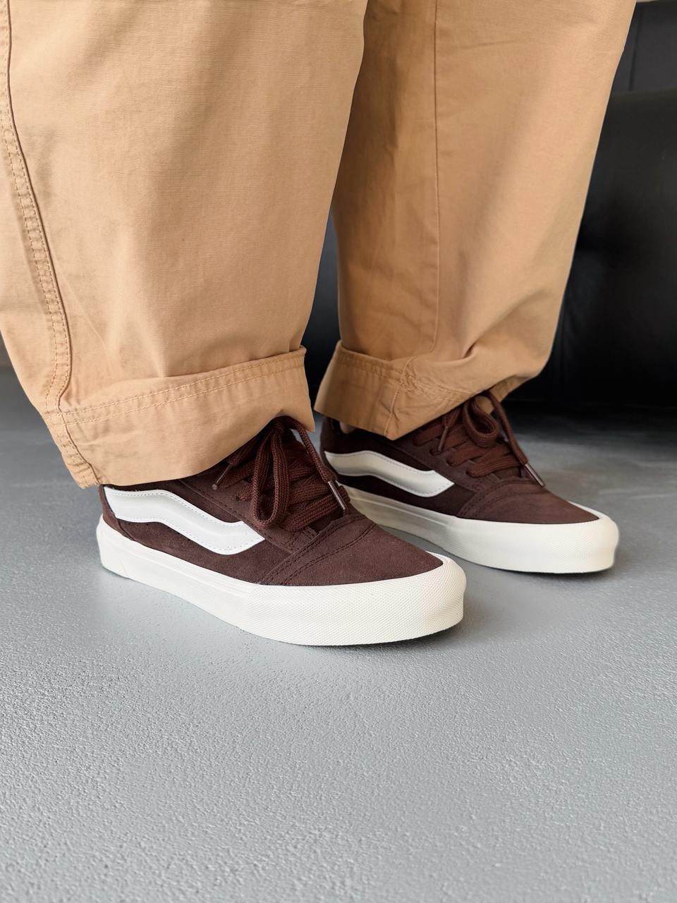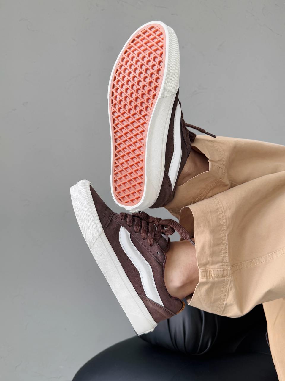 Vans KNU Skool Brown White — це поєднання масивного скейтерського силуету, теплої коричневої палітри та щоденного комфорту. Контраст коричневого з білими деталями створює стильний, трохи вінтажний образ, який виглядає актуально й виразно, а фірмовий дизайн Vans додає моделі впізнаваності та характеру.