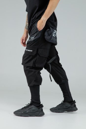 Дві великі бокові накладні кишені. В правій кишені розташовані кишені для мобільного телефону та навушників, в лівій кишені перед боковим швом розташований карабін для ключів.