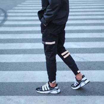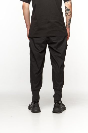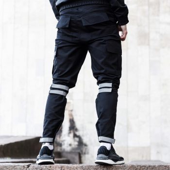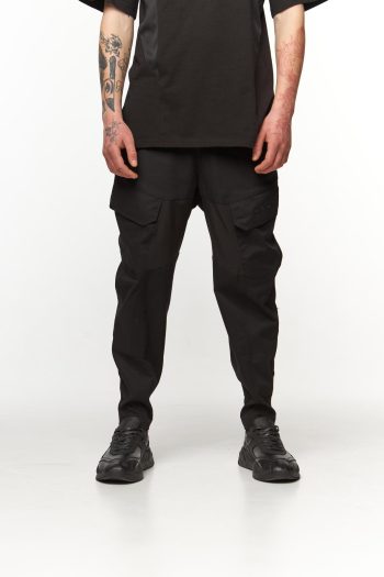 Внизу штанина звужується за допомогою блискавки. На колінах зроблені виточки для комфорту присідання та ходіння. На спинці в області колін зроблені вставки з мікрофлісу та жатки, як верхнього шару. З правої сторони під поясом вшите напівкільце.